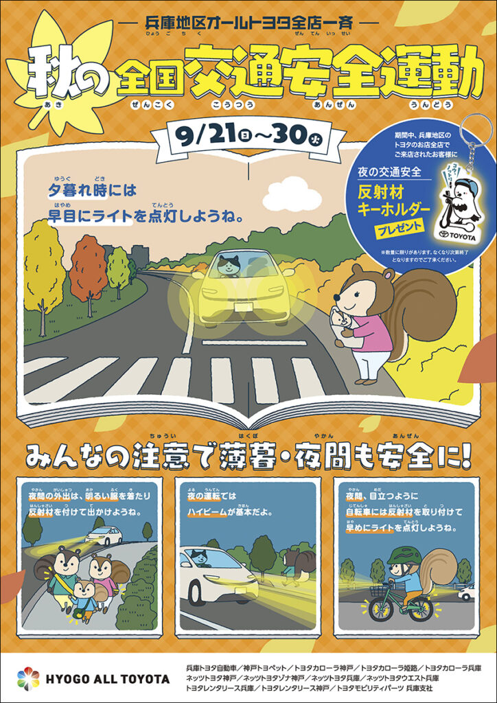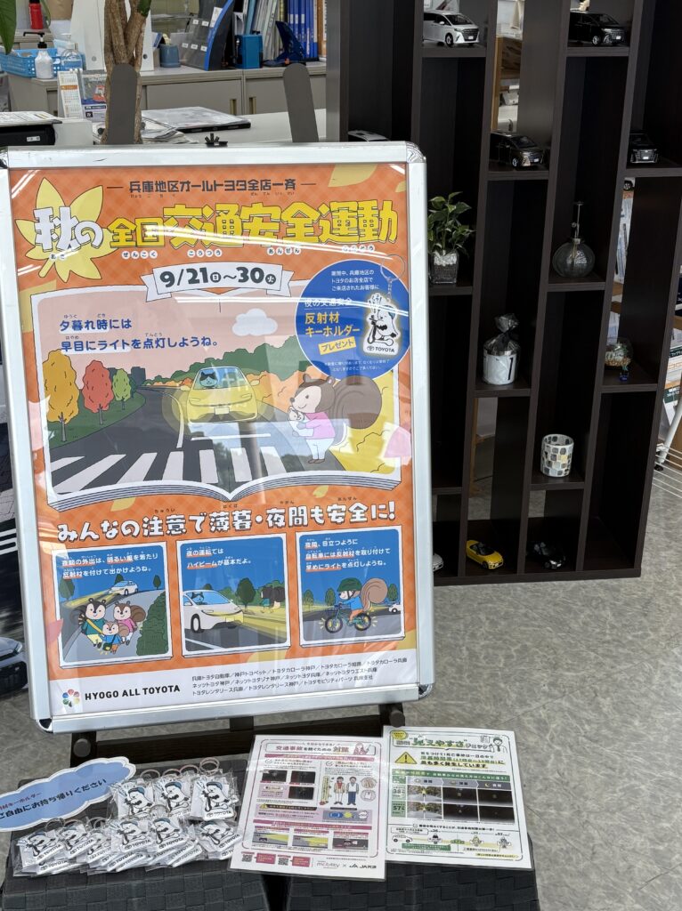 兵庫県オ-ルトヨタでは、9月21日~30日に実施された秋の交通安全運動に連動し、地域の交通事故防止に向けた独自の啓蒙活動を各店頭で行いました。